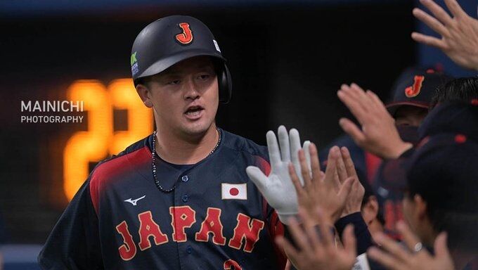 写真は一回表日本代表2死、本塁打を放ち、ベンチ前でチームメートに迎えられる牧秀悟選手です。